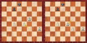 Znovu tedy ještě jednou připomeňme Pachmanovo rčení o platnosti nejrůznějších pravidel a pouček v koncovkách za předpokladu jinak srovnatelných podmínek. To se v plné míře projevilo v druhé ukázce – pozice, která mohla vzniknout ve staré Kasparovově partii.