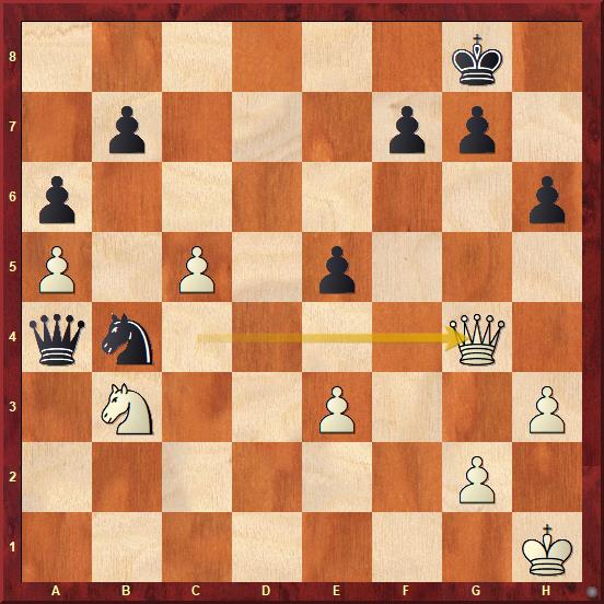 Bílý právě táhl 36.Dc4?, když po 36…Jxb4 plánoval 37.Dg4??.
