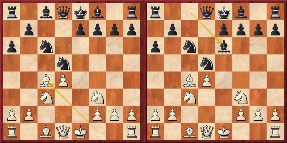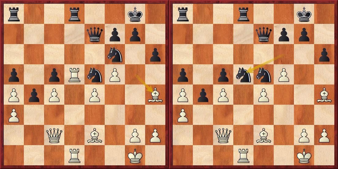 Opar se ovšem rozplyne a uvolní cestu hurikánu. Následovalo 9…Jxc3 10.Sxe6!! (zároveň jediné) 10…Jxd1 11.Sxf7+ Kd7 12.Se6+