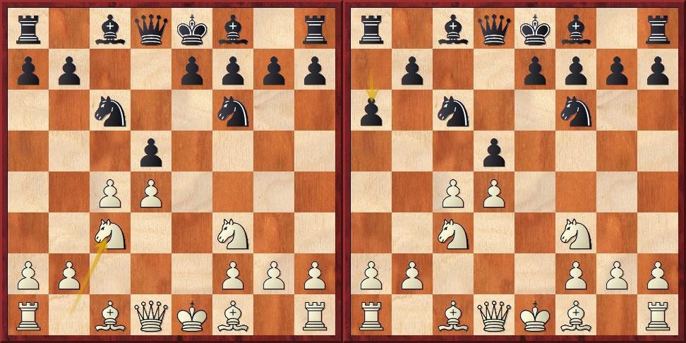 6…a6. Moderní, nikoli však nové; v databázích najdeme dokonce devadesát let (sic!) starou partii Karla Opočenského. Ještě snad dodám, že tradiční 6…Sg4 nikdo nevyvrátil, či spíše „nic nevyvrátilo“ 🙂 , avšak pozice, které vznikají, se mnohým černým prostě nechtějí hrát. Z pochopitelných důvodů, jak uvidíme v přehrávači. Po 7.cxd5 Jxd5 nemohlo oba protivníky překvapit