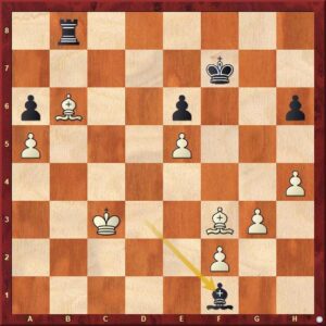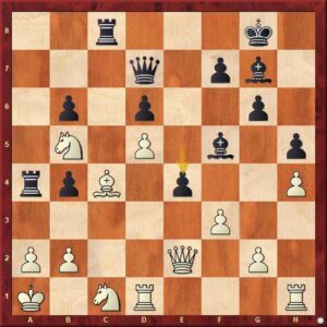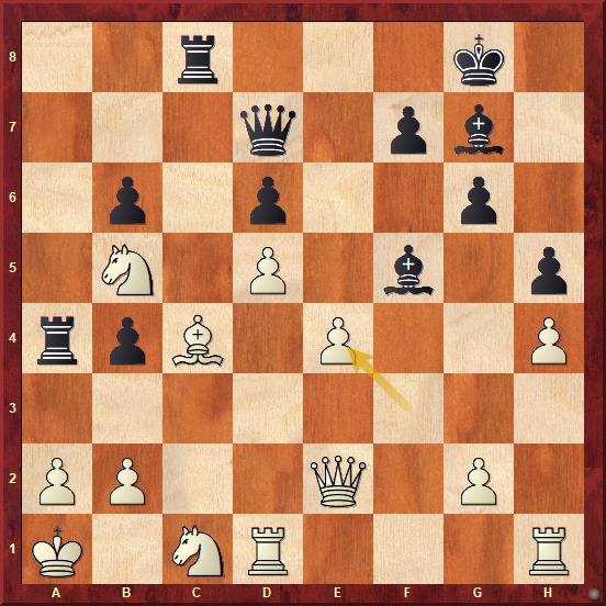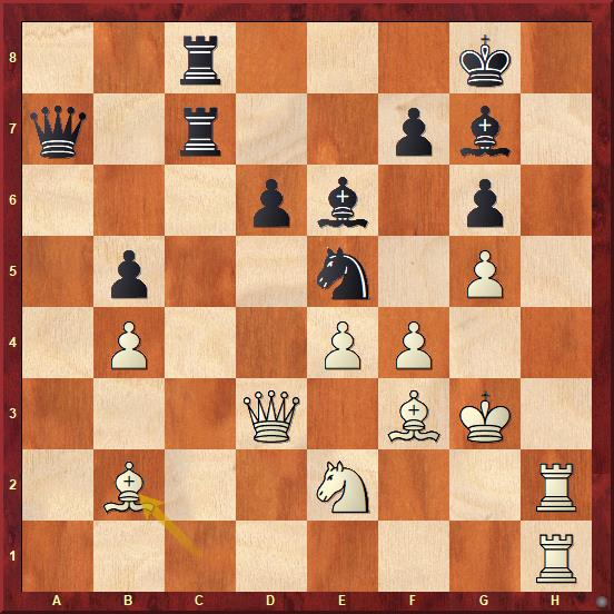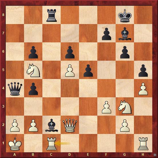 Na šachovnici panuje přibližná objektivní rovnováha, přestože v dopočítačové éře by glosátoři pozici pravděpodobně označili za lepší pro černého. Vždyť ten disponuje nejen mohutným forpostem Jc4, ale i Horwitzovými střelci, když šance bílého podniknout akci po otevřené linii ‚h‘ vypadá iluzorně. Ať tak či tak, běloruský mladík pokračoval po necelých 3 minutách logicky… a chybně 36.Vdh1?