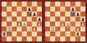 V pozici levého diagramu vidíme, že obě černé figury stojí dobře. Těmito druhy věžových koncovek jsme se již na stránkách zabývali v článku Neporazitelná královna? ze 26. 4. 2025, a tak bychom měli vědět, že „déčko není béčko“ 🙂 ! Více se samozřejmě dozvíme v rozboru přehrávače i videu níže.