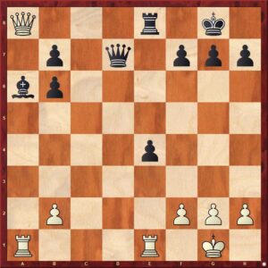 po čemž následovalo 32.Jcb5! Dc4. Není to právě procházka růžovým sadem, ale… dokážete najít bílými vyhrávající pokračování?