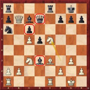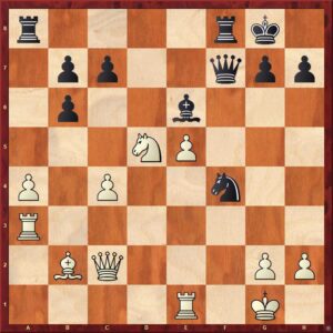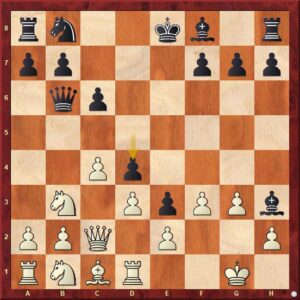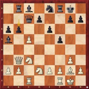 Niemann právě zahrál 14.g3 a opět hrozí 15.Dxb7. Vladimir Fedosejev si možná popletl varianty, spíše se však dopustil typické hrubé chyby, když zápletky řádně nedopočítal. Po více než 8 minutách přemýšlení totiž udeřil 14…Jxc5??, aby se po 15.dxc5 Sxd3 16.Dxb7 vzdal! Teprve nyní totiž uviděl, že na plánované 16…Ja6 následuje efektní 17.Je5!!.
