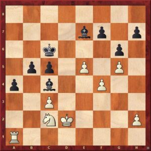 Přiznám se, že mně osobně nepřijde plán s g4-g5 až tak záhadným. Pravda, pozici transformuje a bílý je připraven obětovat kvalitu zpět s přechodem do koncovky jezdce proti střelci při zablokovaném dámském křídle. Navíc vede postup g5 k blokádě – omezení hybnosti – královského křídla i ohraničení působnosti černopolného střelce. Více se „problémem blokády pěšcové majority“ zabývám v celkem podrobné analýze partie, a tak zde uvedu jen jeden diagram konečné pozice rozboru. Ten myslím i tak dobře ilustruje „o co jde“.
