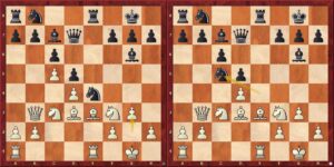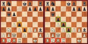 Pozici levého diagramu pokračoval bílý 18.e4, aby se po protivníkově dvaatřicetiminutém přemýšlení střetl s 18…c5!!. Jde o reálnou dynamickou oběť figury, ovšem zápletky jdou mnohem hlouběji, nežli by se mohlo zdát po zběžném pohledu na pravý diagram. Nejde tedy pouze o 20.bxc5 bxc5 21.Vxb7? cxd4. Gukesh strávil půlhodinu hlubokým propočtem a především zhodnocením pozic po 21.e5 cxd4 21.exf6
