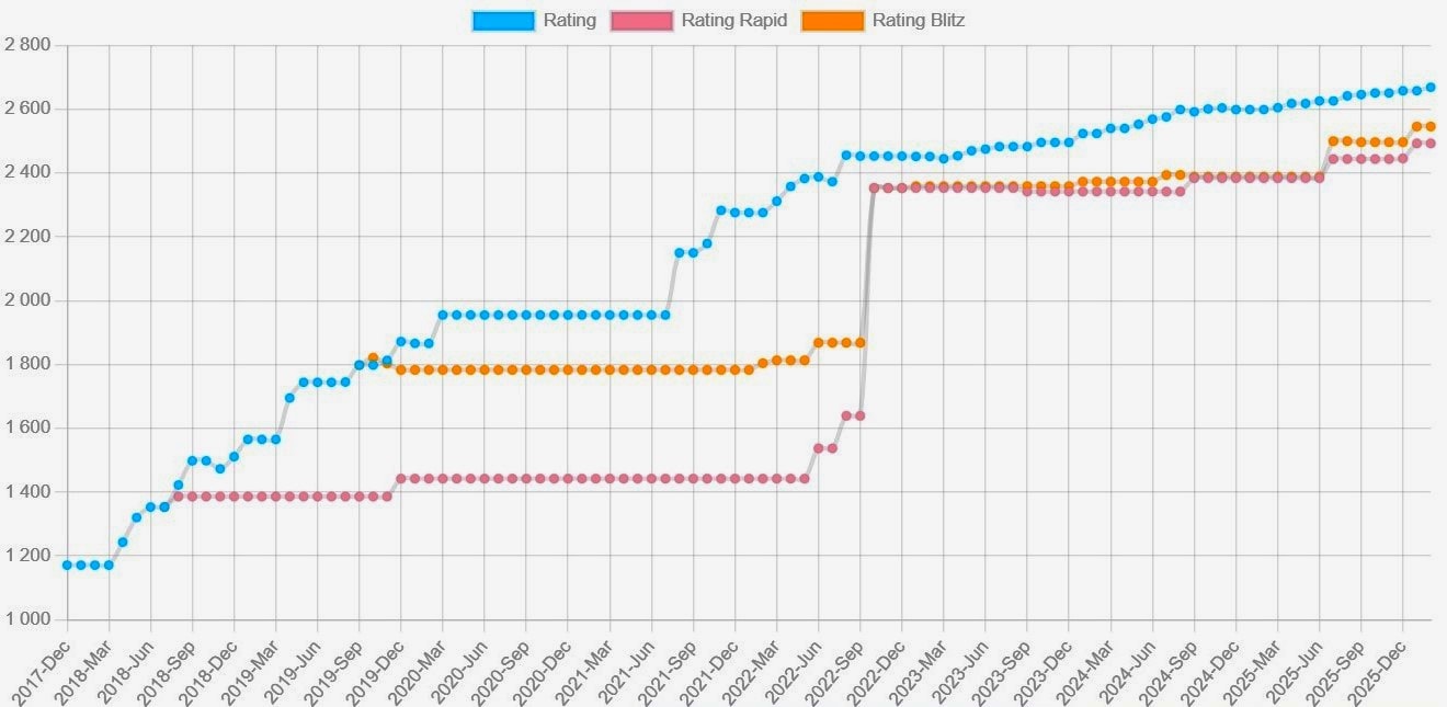 V přehledném grafu ze stránek rating.fide.com vidíme Yagizův trvalý vzestup výkonnosti. Současný rating 2 669 ještě nereflektuje zisk dalších přibližně 18 bodů, které nabral ve Wijk aan Zee.