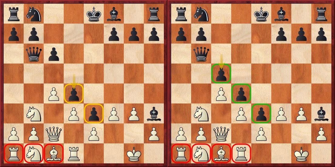 Po 12…d4 se v partii objevila pozice levého diagramu.