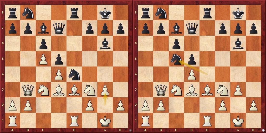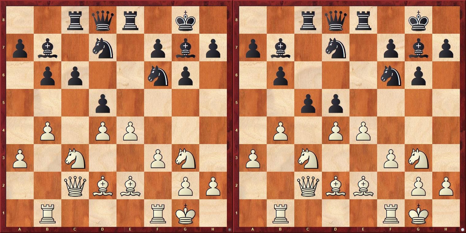 Pozici levého diagramu pokračoval bílý 18.e4, aby se po protivníkově dvaatřicetiminutém přemýšlení střetl s 18…c5!!. Jde o reálnou dynamickou oběť figury, ovšem zápletky jdou mnohem hlouběji, nežli by se mohlo zdát po zběžném pohledu na pravý diagram. Nejde tedy pouze o 20.bxc5 bxc5 21.Vxb7? cxd4. Gukesh strávil půlhodinu hlubokým propočtem a především zhodnocením pozic po 21.e5 cxd4 21.exf6