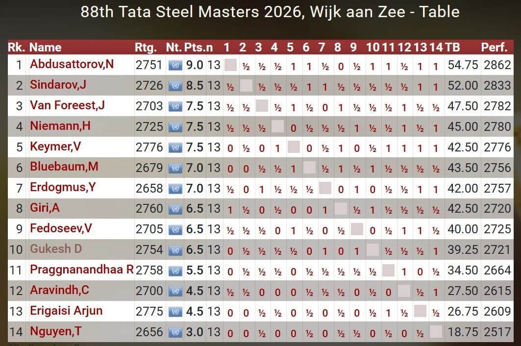 Před posledním kolem nebylo tedy – na rozdíl od londýnského turnaje 2025 či pražského 2024 – ještě jasno. Tím spíše, že Abdusattorova čekal bílými kameny Arjun Erigaisi! I ve své – opět, stejně jako loni – celkem mizerné formě víme, že Erigaisi je schopný porazit kohokoli. Paradoxně ale právě on je z určitého pohledu ideálním protivníkem do posledního kola. Tím spíš, když vládne bílými figurami.