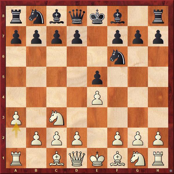 Pokud se černý nemůže opřít o výpady na b4, ocitá se hra objektivně v rovnováze. Dodejme však, že černý by musel být obeznámen s teorií a vědět, jak pokračovat už v nejbližších tazích — což polský velmistr zjevně nebyl. Nad následujícím přirozeným tahem 5…Jc6 strávil devět minut, nad dalším pět a nad svým desátým tahem dokonce patnáct minut. Partii bez vážnějšího odporu vzdal ještě před časovou kontrolou.