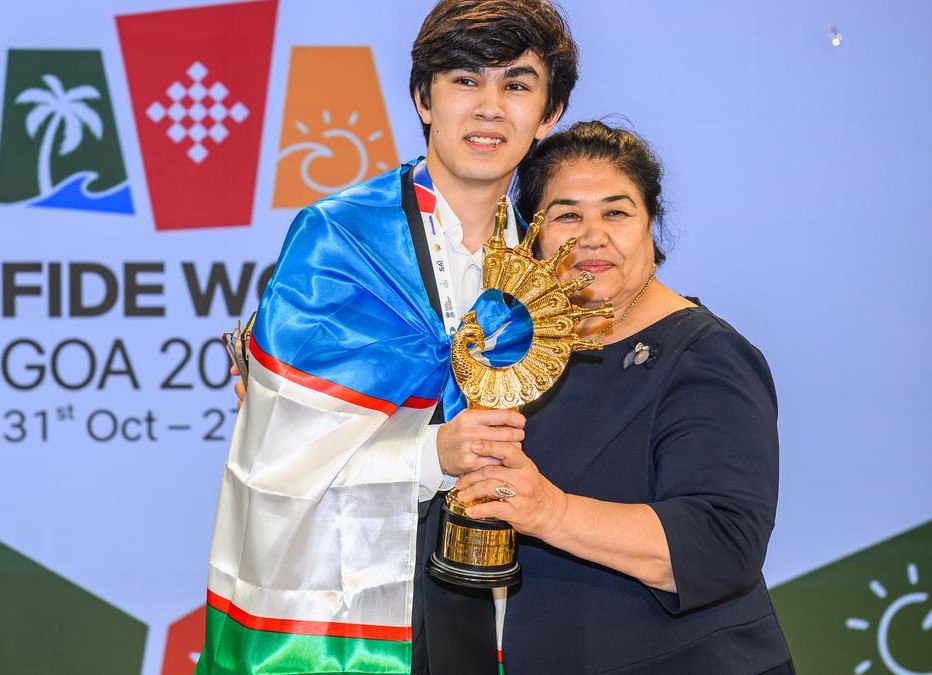 Javokhir Sindarov se svou babičkou. Právě prarodiče jej přivedli k šachu a vždy jej podporovali. Uspěje v turnaji kandidátů 2026 i tentokrát nejmladší účastník?