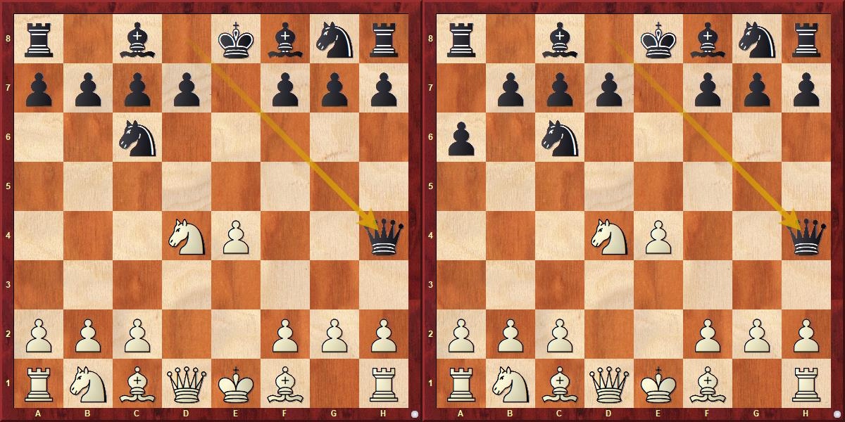 - Hrává se po e4 e5 2.Jf3 Jc6 3.d4 exd4 4.Jxd4 i výpad 4…Dh4? Pokud ano, jakou má pověst?