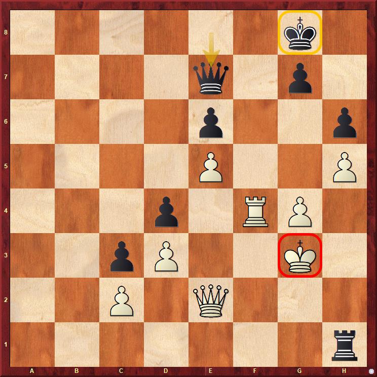 Černý právě dobral po výměně střelce na e7 a hrozí strašlivým 57…Dh4+. Bílý má jedinou cestu k remíze! Tu by podle mého nepochybně našel, kdyby měl na hodinách alespoň několik minut, a ne jen pár posledních sekund.